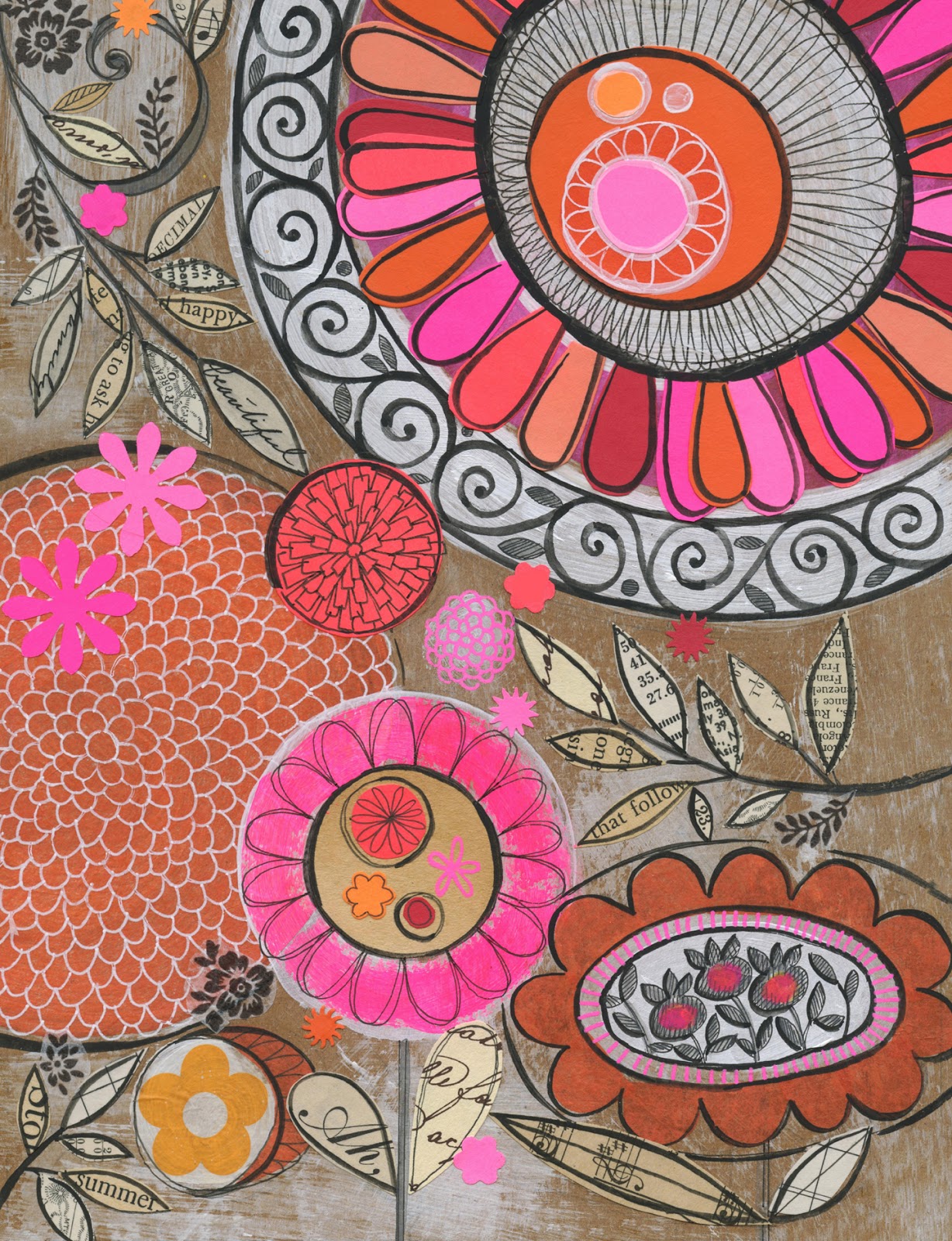 Even though I do trust that my creative style is ever evolving these pieces above, these bold florals, with their neon bits on white washed kraft cardboard (the back page of pads of tracing paper) have become my current signature, at least to me. I recently had the gig poster I did early this past summer for Kim Harris enlarged, an 18 x 24 giclee print that now leans (I'm a terrible leaner, not yet a hanger ;-) in our beautiful clean, white renovated bathroom. I love it. I framed it a very affordable poster frame that comes with a thin sheet of plexi/plastic instead of glass that I ordered from Deserres a Canadian art supply store with a fabulous shop location in Halifax and a regular haunt when I'm in the city visiting with MLou. We deprived Nova Scotians do not have an Ikea (very sad face).